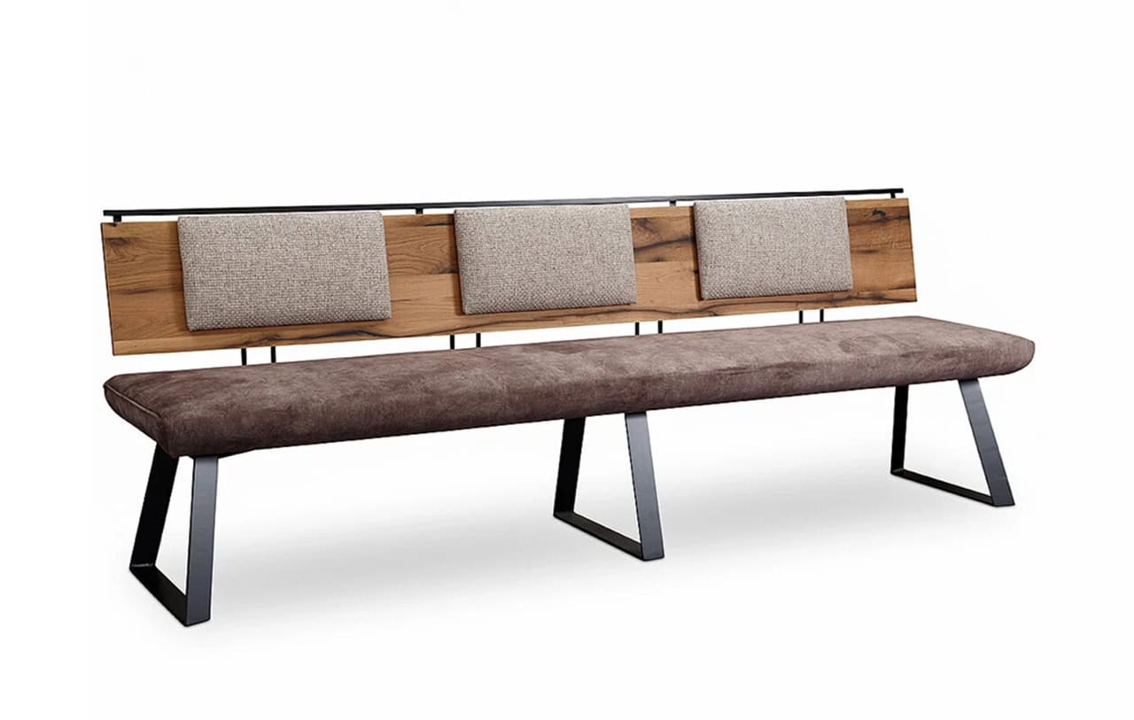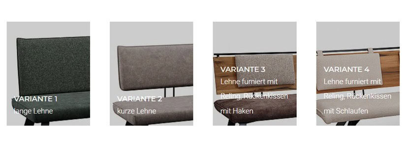 Vielfältige Lehnenvarianten: lange, kurze oder furnierte Lehnen mit verschiedenen Rückenkissenoptionen.