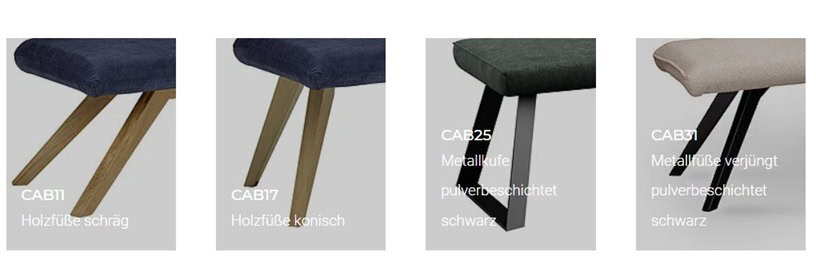 - Holz- oder Metallfüße, kantig oder konisch