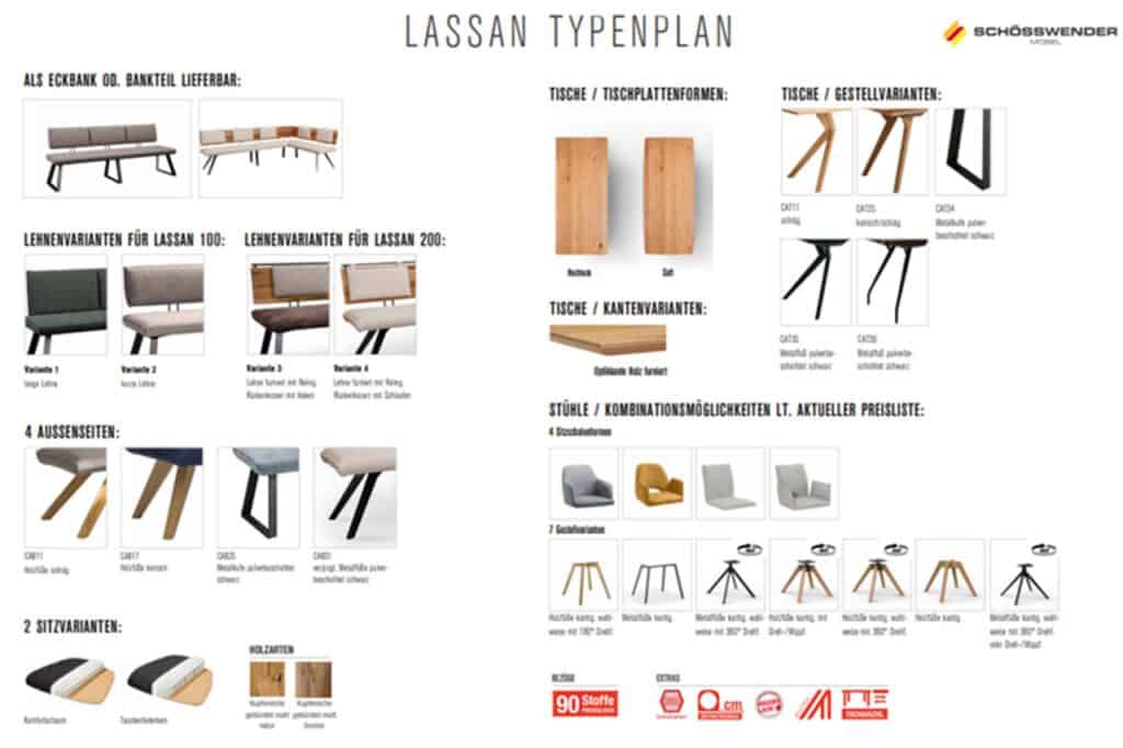 - Lehnenformen: Lange oder kurze Lehne (Lassan 100), furnierte Lehne mit Reling und Rückenkissen mit Haken oder Schlaufen (Lassan 200)