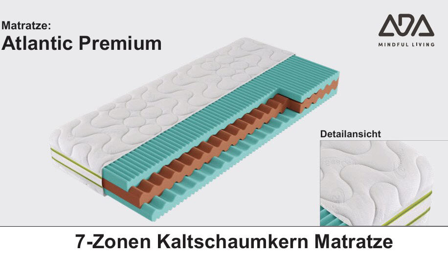 Druckentlastender 7-Zonen Kaltschaum mit Wellenkonturschnitt und optimaler Querbelüftung. Basiskern aus EMC mit einem hohen Anteil an natürlichem Rizinusölen, Auflagen aus Tencel Kaltschaum mit Wellenkonturschnitt sorgt für ein trockenes Schlafklima.