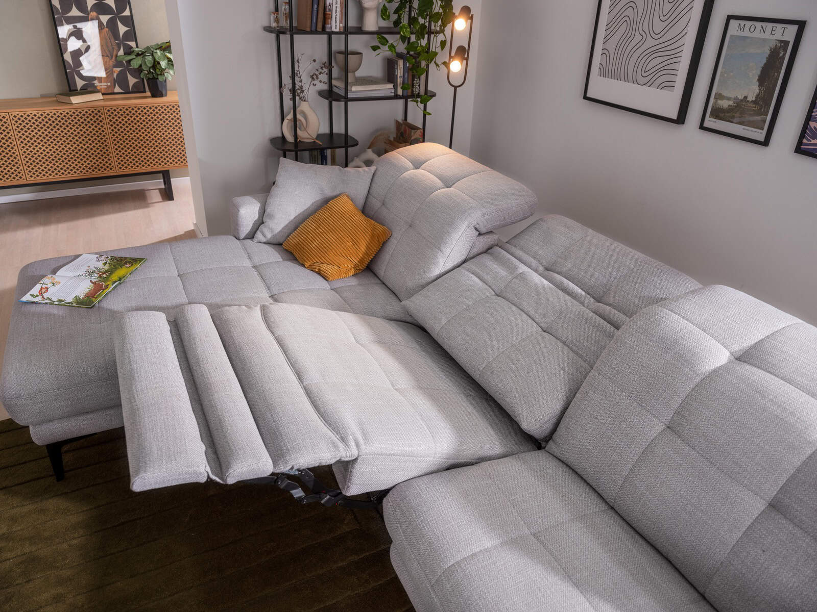 Der Clou: Der Allrounder wartet mit einer technischen Raffinesse auf – dem Wallfree-Beschlag. So kann die integrierte Relaxfunktion genutzt werden, auch wenn das Sofa direkt an der Wand steht. Leichtgängig manuell verstellbar oder ganz bequem elektrisch auf Knopfdruck lassen sich die Sitzelemente in jede gewünschte Entspannungsposition bringen. Dabei benötigt die sich angenehm nach hinten neigende Rückenlehne einen so geringen Radius, dass ALMERE ebenso frei im Raum wie auch direkt an der Wand positioniert werden kann.