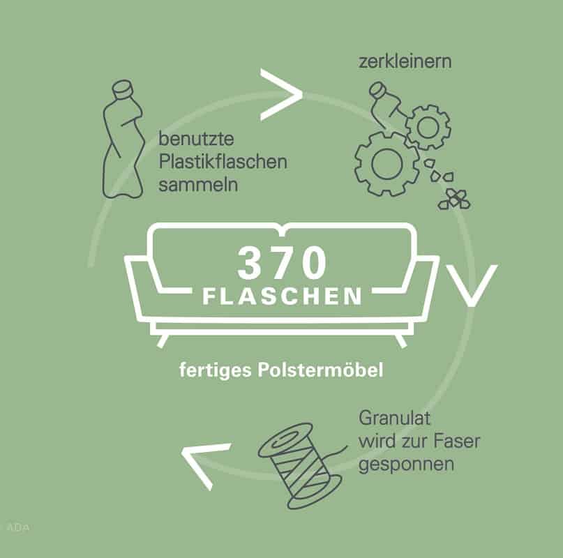Jetzt gibt es einen neuen, einzigartigen und umweltschonenden Recyclingweg um Möbelstoffe herzustellen, der die ganze Flasche aufbereitet und an dessen Ende ein Sofa steht: Beim PET-Recycling werden die Flaschen zerquetscht und alle Labels entfernt. Anschließend wird das Plastik zerkleinert, blitzblank gereinigt und zu Granulat pulverisiert. Und aus diesem Granulat fertigt das neue, innovative Verfahren einen schicken, leinenartigen Stoff. Er ist robust, pflegeleicht, dank EAYS CLEAN-Technologie schmutzabweisend und komplett nachhaltig. Rund 370 recycelte PET-Flaschen beziehen ein Sofa, 150 recycelte PET-Flaschen einen Sessel.