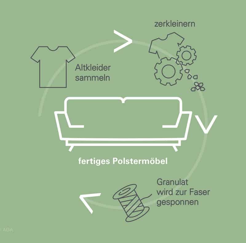 Dieses Garn fließt nun in die neuartigen Refabric-Stoffe ein, die mithilfe von Web- und Strickverfahren produziert werden. So erhalten Altkleidern aus Kunstfasern ein neues, sinnvolles Leben als Polstermöbel.