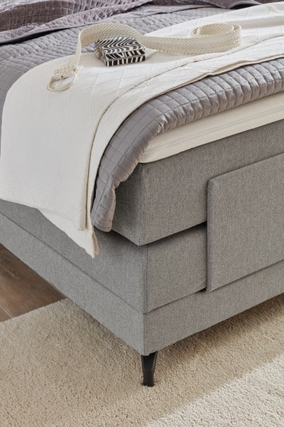 Wie für ein Boxspringbett typisch, bildet eine Federkernbox die Basis. Darauf werden die Matratzen gelegt, die Sie je nach Schlafbedürfnis zu Ihrem neuen Traumbett hinzufügen können. Bügel am Fußende halten den Aufbau stets in Form und verhindern ein Verrutschen der Matratze während des Liegens.