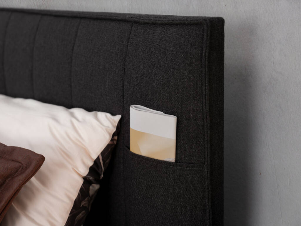 Praktische Stofftaschen am Bettkopf sorgen für das gewisse Extra. Der straff gepolsterte Bettkasten wurde zudem etwas breiter als die darauf liegenden Matratzen gestaltet, damit ein noch gemütlicherer Eindruck entsteht.