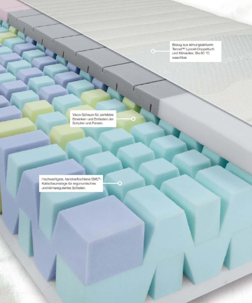 und exklusiven Aufbau hat: So wird im Schulterbereich Visco-Schaum verwendet, um ein perfektes Einsinken und Entlasten der Schulter zu gewährleisten. Der Fersenbereich besteht aus ganz weichem Normalschaum, damit die Ferse, die meist auf die Fläche betrachtet dem
