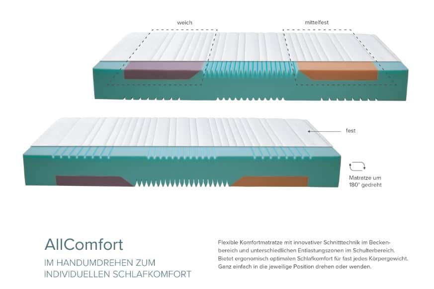 Flexible Komfortmatratze mit innovativer Schnitttechnik im Beckenbereich und unterschiedlichen Entlastungszonen im Schulterbereich. Bietet ergonomisch optimalen Schlafkomfort für fast jedes Körpergewicht. Ganz einfach in die jeweilige Position drehen oder wenden!