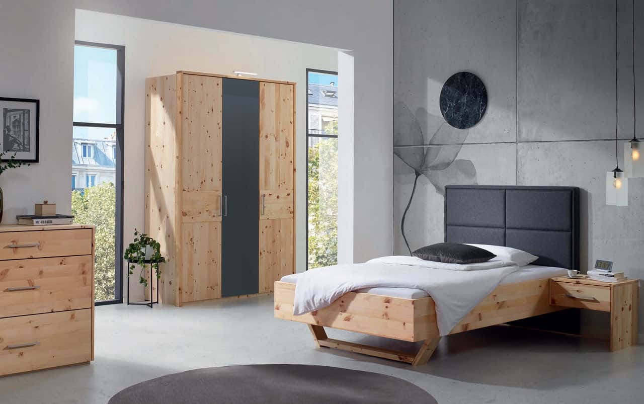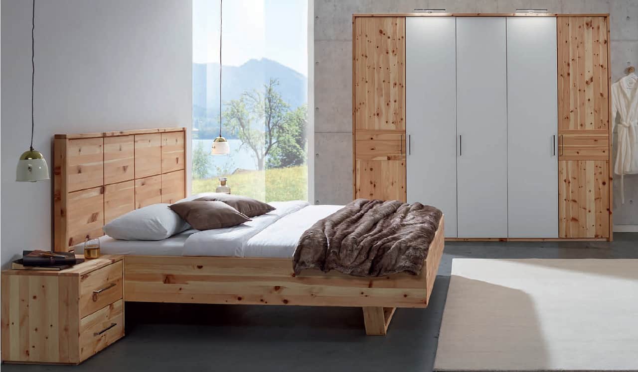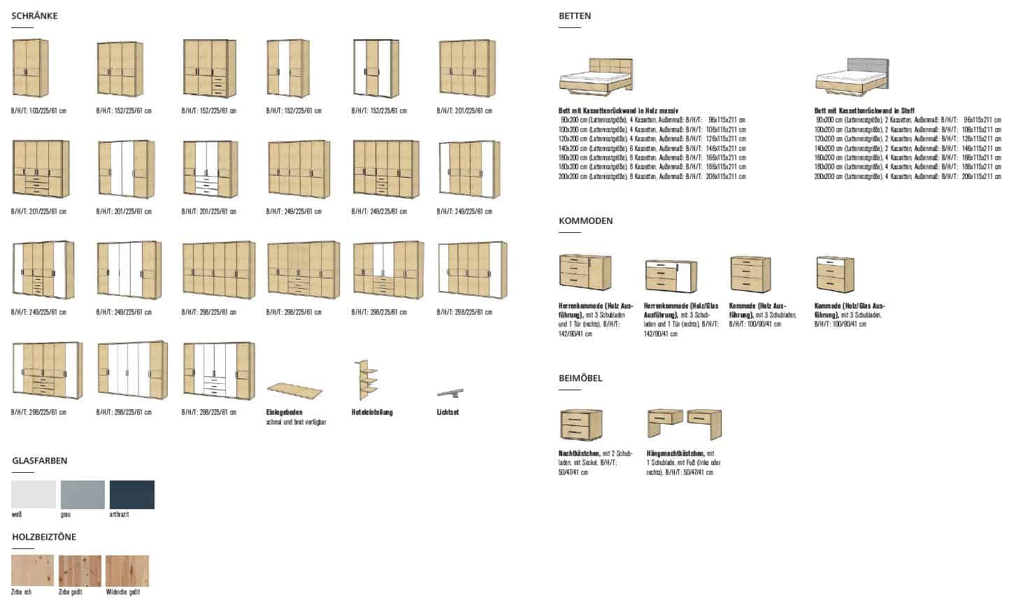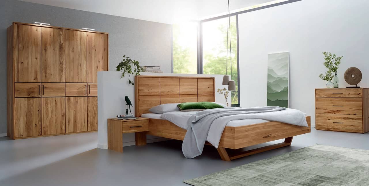 Eiche: Korpus massiv keilverzinkt, Türen massiv stabverleimt, Bett keilverzinkt und stabverleimt.