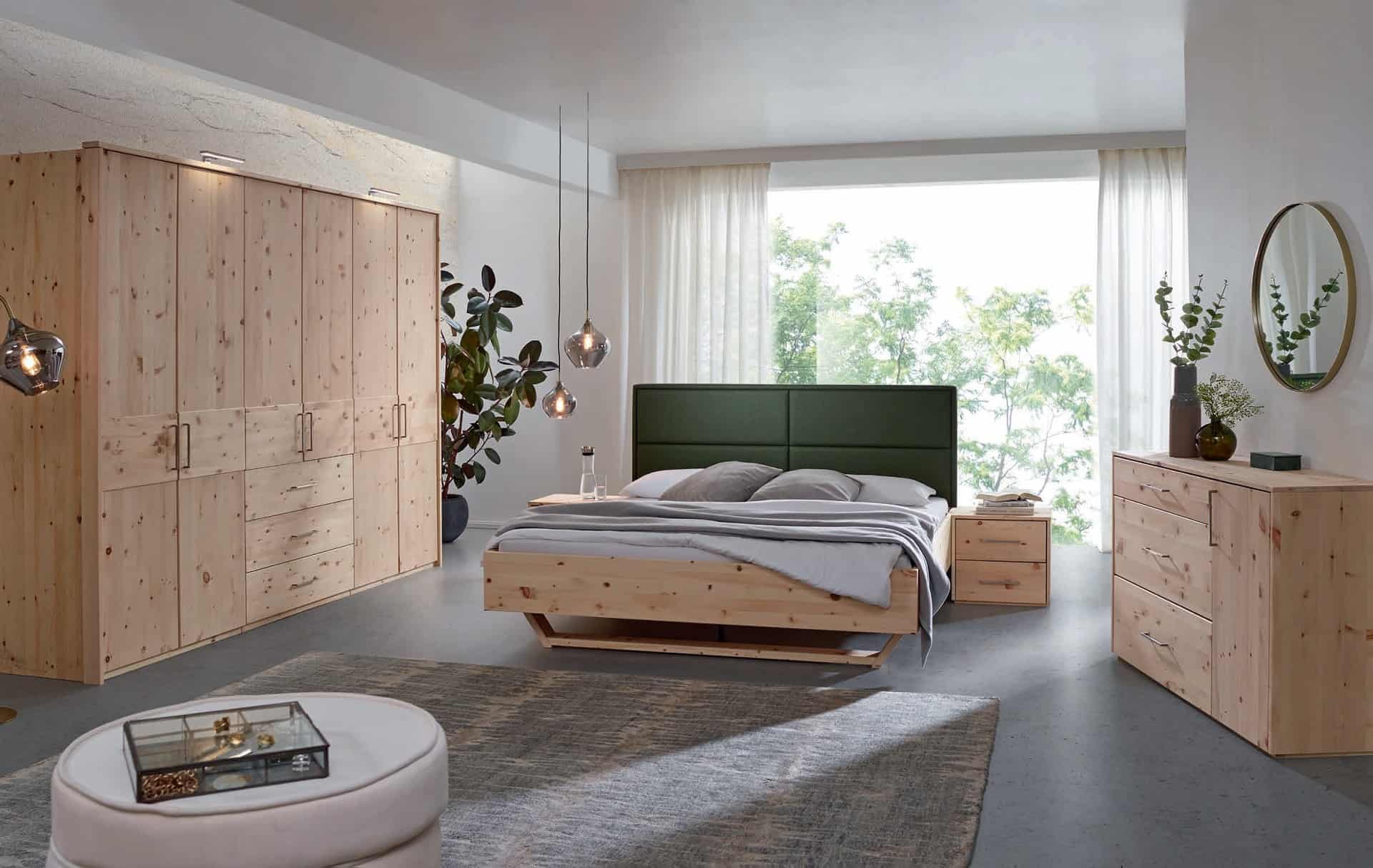 Fronten Zirbe massiv, Korpus Seiten, Deck und Sockelboden Zirbe massiv, Böden und Mittelseiten werden in Zirbe massiv und in Fichte massiv