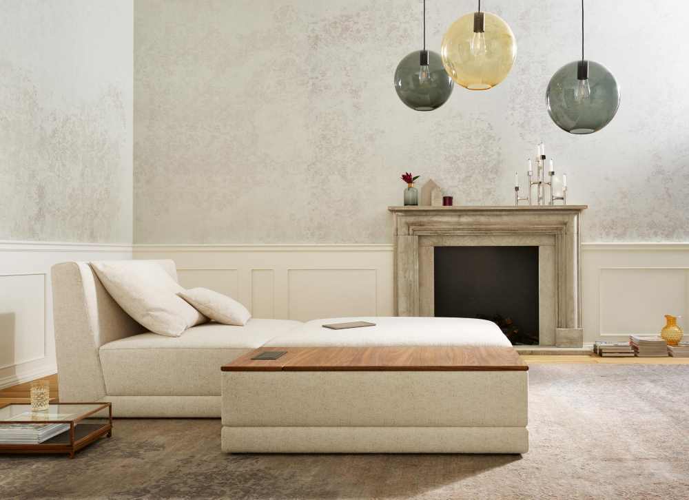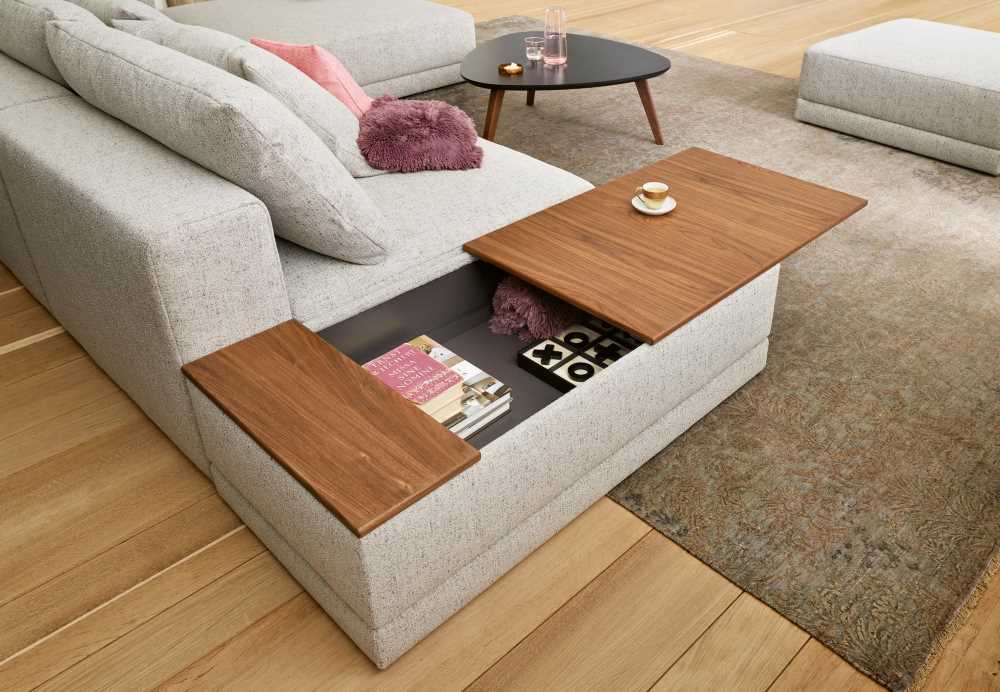 ist in zwei Ausführungen – mit und ohne Elektro-Element möglich. Das Elektro-Element beinhaltet zwei Steckdosen und einen USB-Anschluss. Durch ein Aufschieben der Tischplatte erhält man zusätzlichen Stauraum zum Aufbewahren und Verstauen von Kissen und Co.