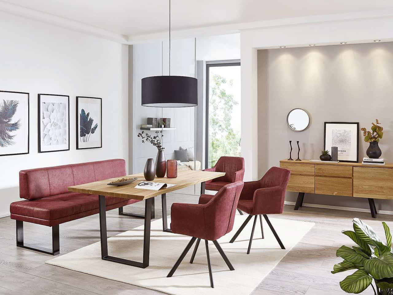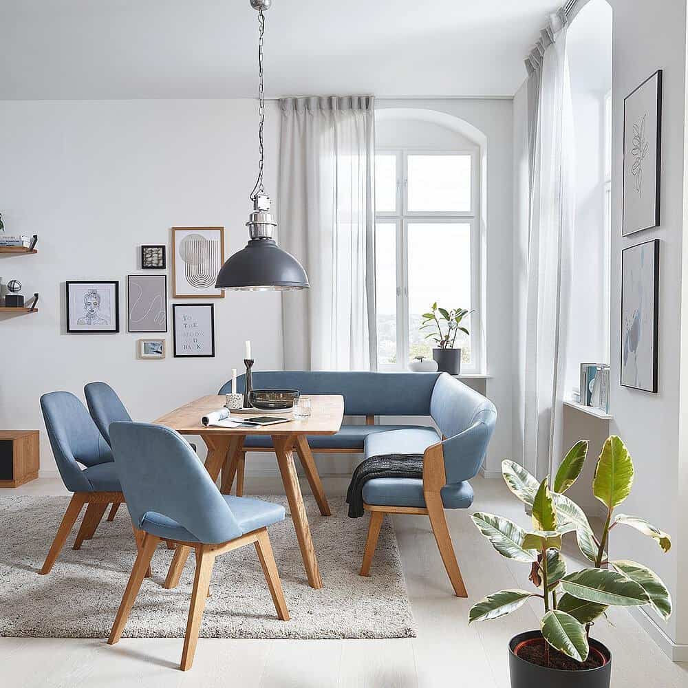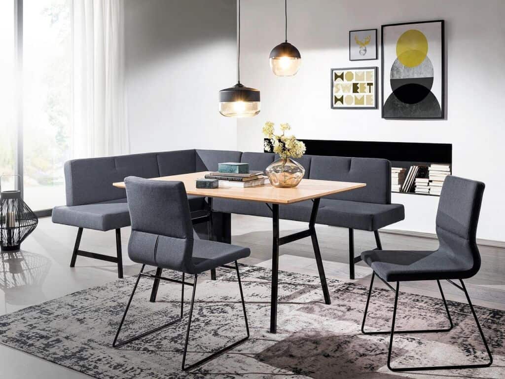 Die Eckbank passt in den kleinsten Raum und nutzt die vorhandene Fläche ideal, die sie im Gegensatz zu Stühlen direkt an der Wand steht und nicht verrückt werden muss. Wenn Sie die Eckbank freistehend im Raum platzieren, kann sie als Raumteiler zwischen Wohn- und Esszimmer dienen.